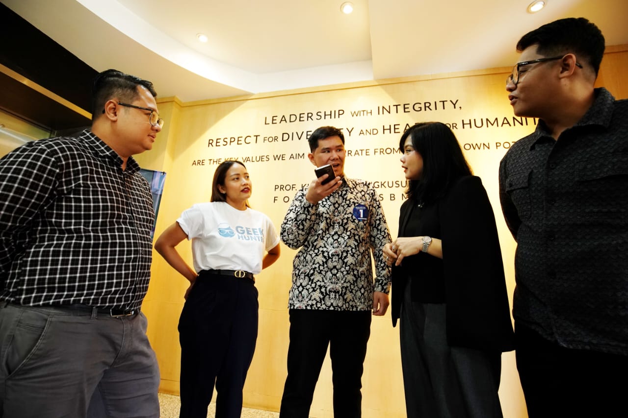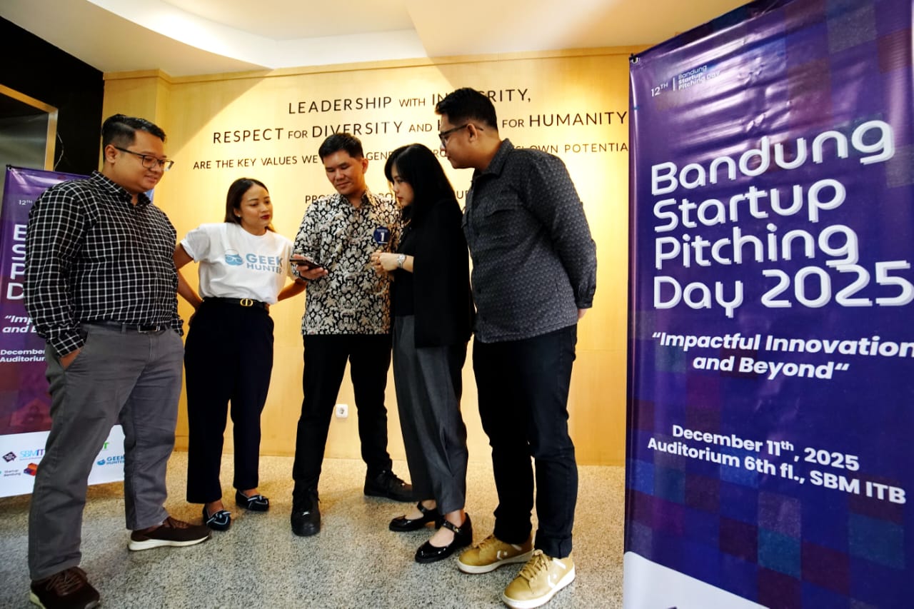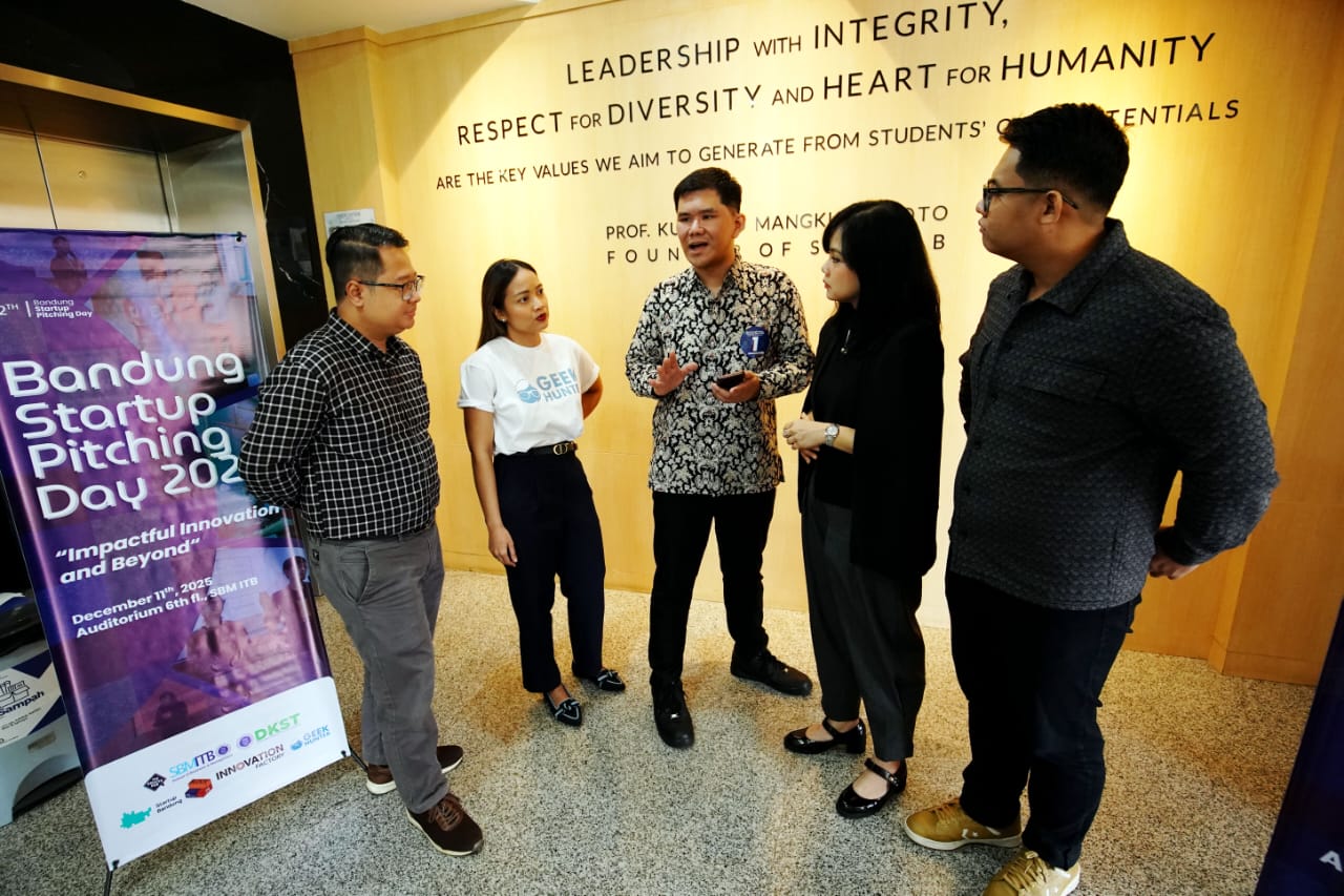 BANDUNG – Perwakilan startup (tengah) menjelaskan inovasi produknya kepada Deputi Direktur Bidang Inkubasi dan Akselerasi Bisnis Direktorat Kawasan Sains dan Teknologi (DKST) Institut Teknologi Bandung (ITB) Fathiro Hutama Reksa Putra (dari kiri), Founder & CEO Geekhunter Ken Ratri Iswari, Director of The Greater Hub Sekolah Bisnis Manajemen (SBM) ITB Dina Dellyana, dan Program Manager at NUS Enterprise Alif Bahsyar di sela-sela acara Bandung Startup Pitching Day (BSPD) 2025 di Gedung Freeport SBM ITB, Jalan Ganesha, Kota Bandung, Kamis (11/12/2025).