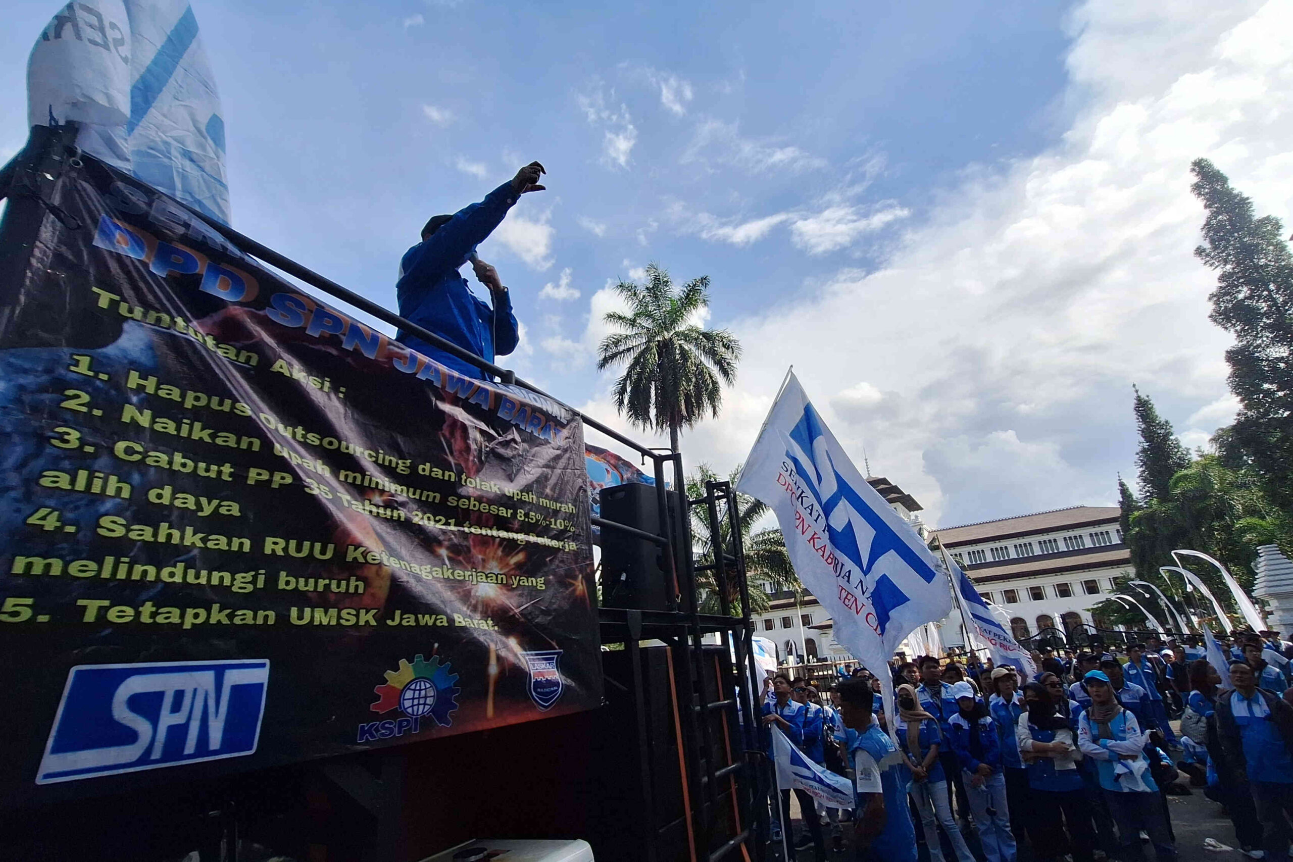 BANDUNG – Ratusan masa yang tergabung dalam Serikat Pekerja Nasional (SPN) Jawa Barat menggelar aksi unjuk rasa di depan Gedung Sate, Kota Bandung, Selasa (16/12/2025) Mereka menuntut kepada pemerintah agar segera mengeluarkan regulasi untuk menetapkan kenaikan upah minimum tahun 2026 mendatang.