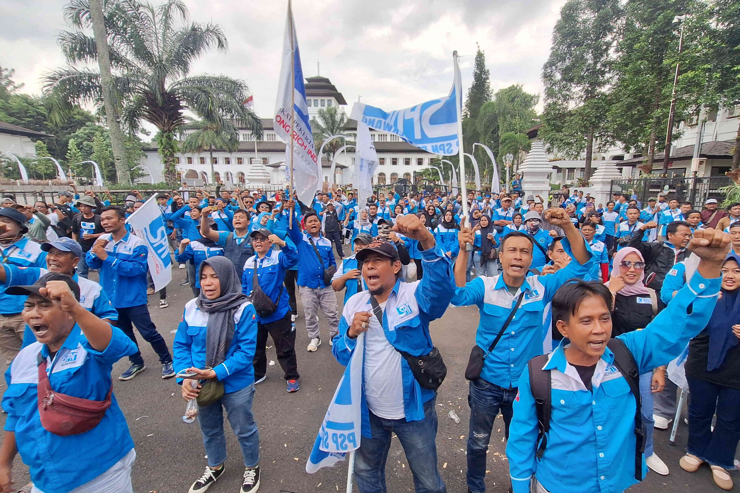 BANDUNG – Ratusan masa yang tergabung dalam Serikat Pekerja Nasional (SPN) Jawa Barat menggelar aksi unjuk rasa di depan Gedung Sate, Kota Bandung, Selasa (16/12/2025) Mereka menuntut kepada pemerintah agar segera mengeluarkan regulasi untuk menetapkan kenaikan upah minimum tahun 2026 mendatang.