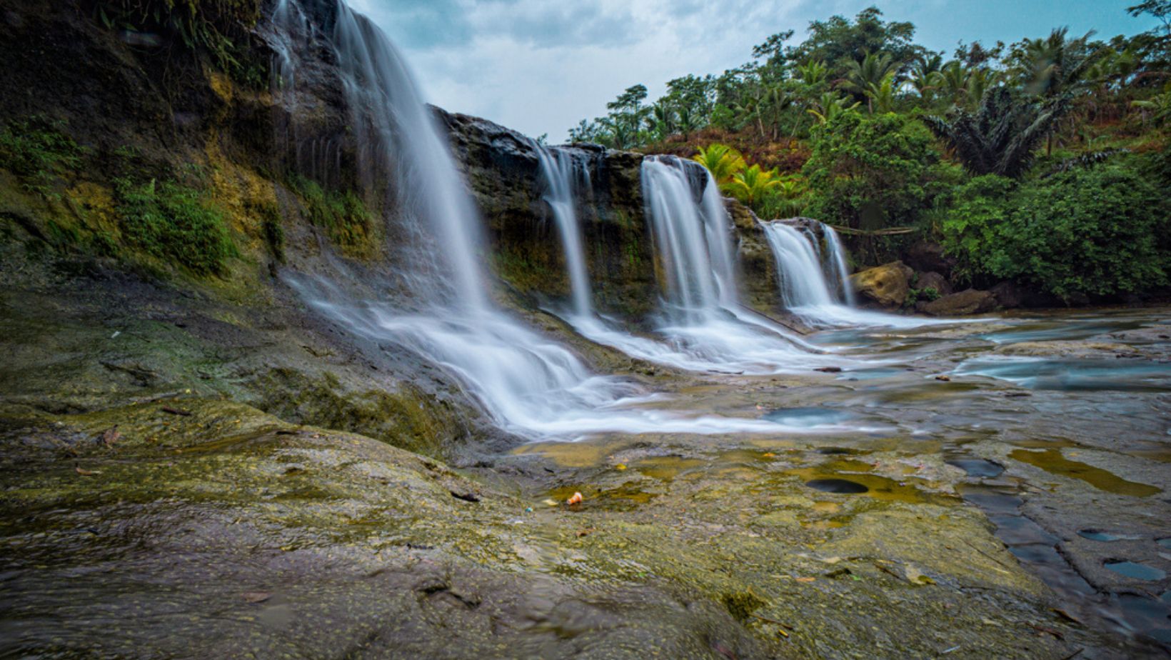 Fotografi Alam: Bentuk air terjun bertingkat dengan latar sawah dan perbukitan sangat ideal untuk fotografi lanskap.