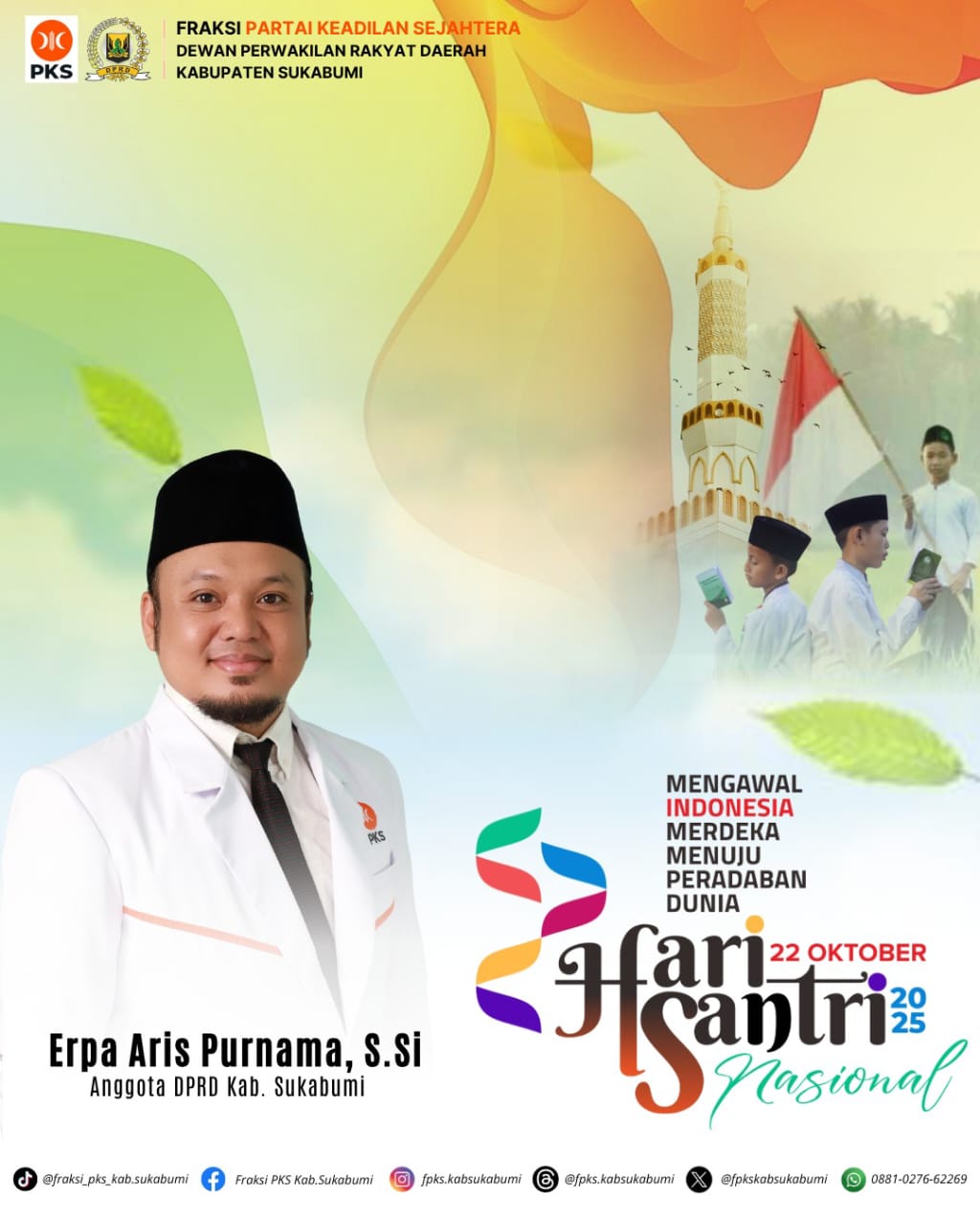 SUKABUMI — Dalam momentum peringatan Hari Santri Nasional 2025, Anggota DPRD Kabupaten Sukabumi dari Fraksi Partai Keadilan Sejahtera (PKS), Erpa Aris Purnama, menyampaikan apresiasi dan penghargaan setinggi-tingginya kepada seluruh santri di Indonesia, khususnya di Kabupaten Sukabumi.