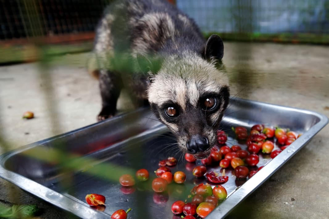 Seekor Luwak memakan biji kopi cherry untuk dilakukan fermentasi alami dalam produksi kopi luwak di Bareto Coffee