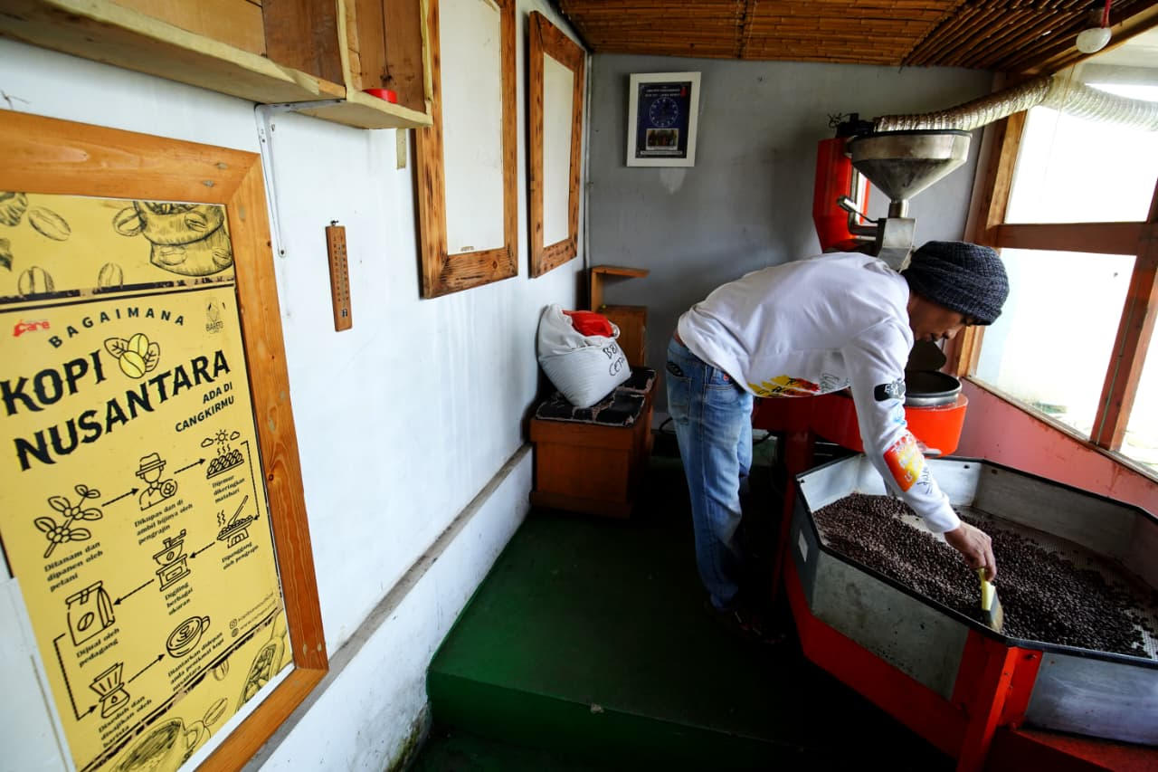 Pekerja melakukan proses roasting biji kopi menggunakan mesin sangrai di Bareto Coffee, Pangalengan.(*)