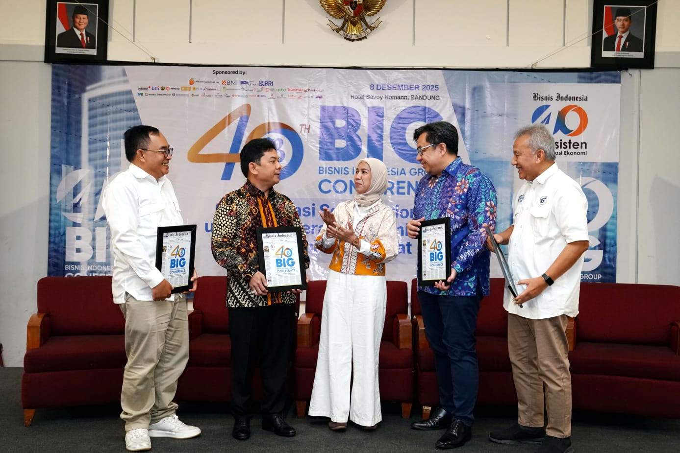 Sekretaris Daerah Provinsi Jawa Barat Herman Suryatman (dari kiri) membuat konten media sosial bersama Kepala Perwakilan Bisnis Indonesia Jawa Barat Dinda Wulandari, Pengamat Ekonomi Universitas Pasundan (Unpas) Acuviarta, Deputi Kepala Kantor Perwakilan Bank Indonesia (KPw BI) Provinsi Jawa Barat Muslimin Anwar, Kepala Bidang Perekonomian dan Sumber Daya Alam Badan Perencanaan Pembangunan Daerah (Bappeda) Jawa Barat Eka Jatnika, dan Ketua Dewan Pakar Himpunan Kerukunan Tani Indonesia (HKTI) Jawa Barat Entang Sastraadmaja di sela-sela acara Bisnis Indonesia Economic Outlook (BIEO) 2026 di 2026 di Savoy Homann Hotel, Kota Bandung, Jawa Barat, Senin (8/12/2025). Pemerintah Provinsi Jawa Barat optimis Laju Pertumbuhan Ekonomi (LPE) pada tahun 2026 dapat mencapai 5,5% sampai 6%. Salah satu pendorong utama optimisme ini adalah efektivitas pengelolaan anggaran daerah, dimana government spending dijaga dengan baik, ditandai dengan realisasi pendapatan dan belanja yang terbaik secara nasional.