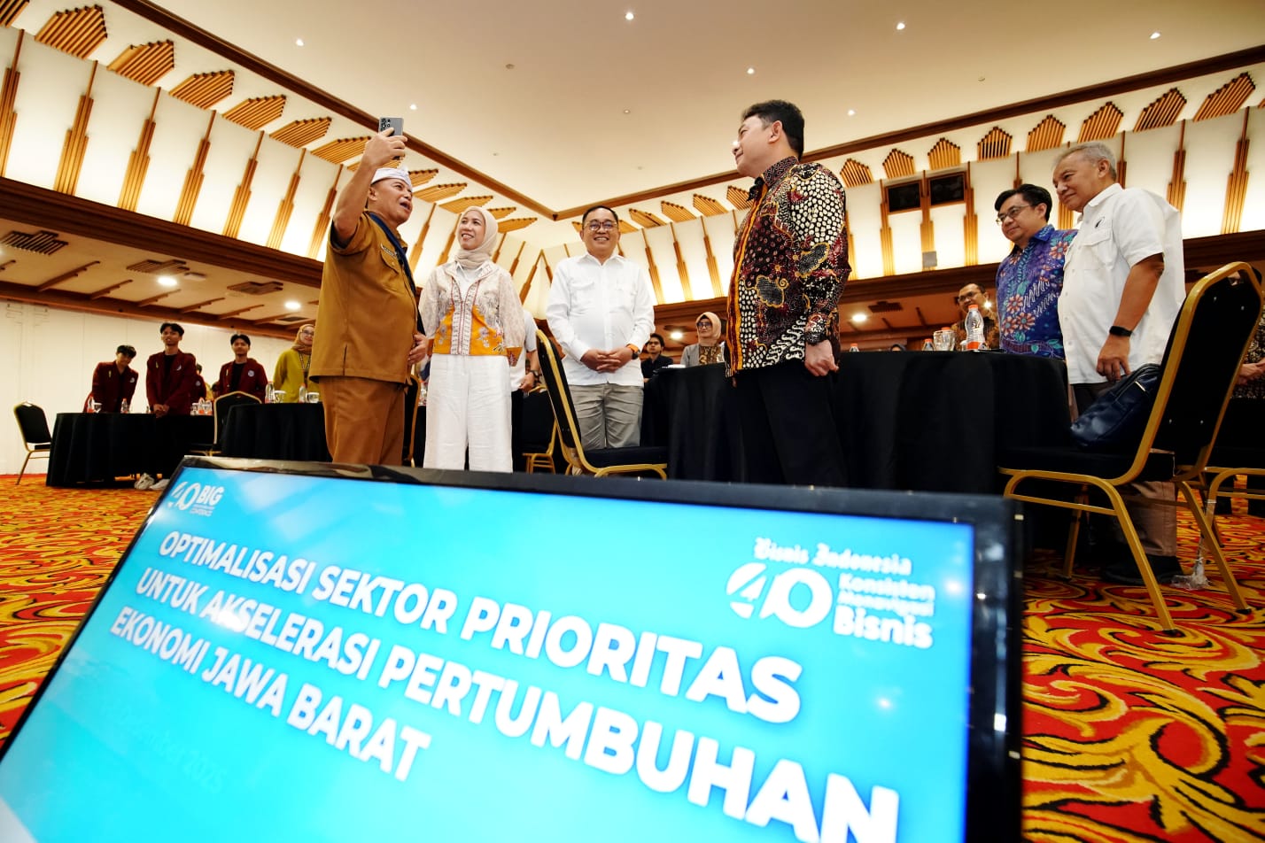 Sekretaris Daerah Provinsi Jawa Barat Herman Suryatman (dari kiri) membuat konten media sosial bersama Kepala Perwakilan Bisnis Indonesia Jawa Barat Dinda Wulandari, Pengamat Ekonomi Universitas Pasundan (Unpas) Acuviarta, Deputi Kepala Kantor Perwakilan Bank Indonesia (KPw BI) Provinsi Jawa Barat Muslimin Anwar, Kepala Bidang Perekonomian dan Sumber Daya Alam Badan Perencanaan Pembangunan Daerah (Bappeda) Jawa Barat Eka Jatnika, dan Ketua Dewan Pakar Himpunan Kerukunan Tani Indonesia (HKTI) Jawa Barat Entang Sastraadmaja di sela-sela acara Bisnis Indonesia Economic Outlook (BIEO) 2026 di 2026 di Savoy Homann Hotel, Kota Bandung, Jawa Barat, Senin (8/12/2025). Pemerintah Provinsi Jawa Barat optimis Laju Pertumbuhan Ekonomi (LPE) pada tahun 2026 dapat mencapai 5,5% sampai 6%. Salah satu pendorong utama optimisme ini adalah efektivitas pengelolaan anggaran daerah, dimana government spending dijaga dengan baik, ditandai dengan realisasi pendapatan dan belanja yang terbaik secara nasional.