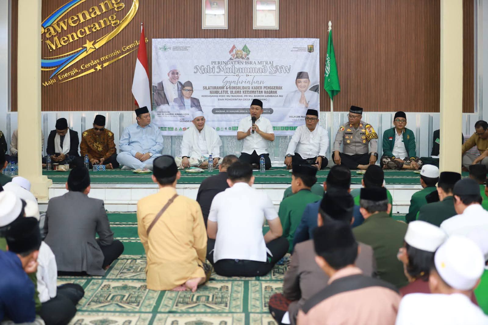 SUKABUMI – Wakil Bupati Sukabumi H. Andreas menghadiri Peringatan Isra Mi’raj Nabi Muhammad SAW yang dirangkaikan dengan Silaturahmi Alumni Pendidikan Dasar–Pendidikan Kader Penggerak Nahdlatul Ulama (PD-PKPNU) MWC NU Kecamatan Nagrak. Kegiatan tersebut digelar di Aula Kantor Desa Pawenang, Kecamatan Nagrak, Minggu (25/1/2025).