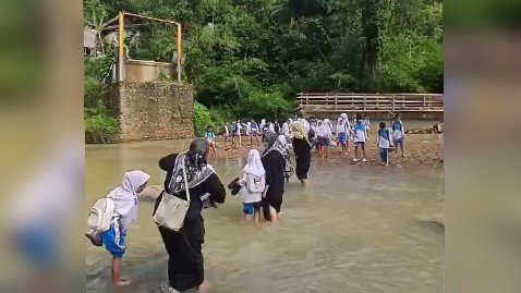 Dalam video tersebut, para siswa terlihat berjalan berbaris dan dipandu oleh guru serta warga setempat agar dapat menyeberang sungai dengan aman. Aksi nekat ini dilakukan karena jembatan penghubung sebelumnya hanyut terbawa banjir pada Desember 2025 lalu dan hingga kini belum ada perbaikan dari pemerintah.