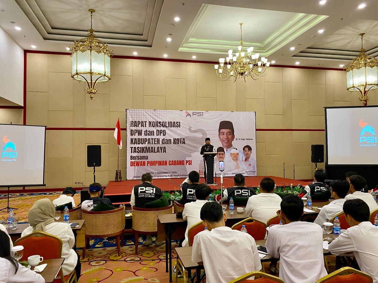 TASIKMALAYA – Ketua DPW Partai Solidaritas Indonesia (PSI) Jawa Barat, Abang Ijo Hapidin, menggelar rapat konsolidasi bersama pengurus DPW dan DPD PSI Kota serta Kabupaten Tasikmalaya di Hotel Alhambra, Singaparna, Sabtu (1/11/2025).