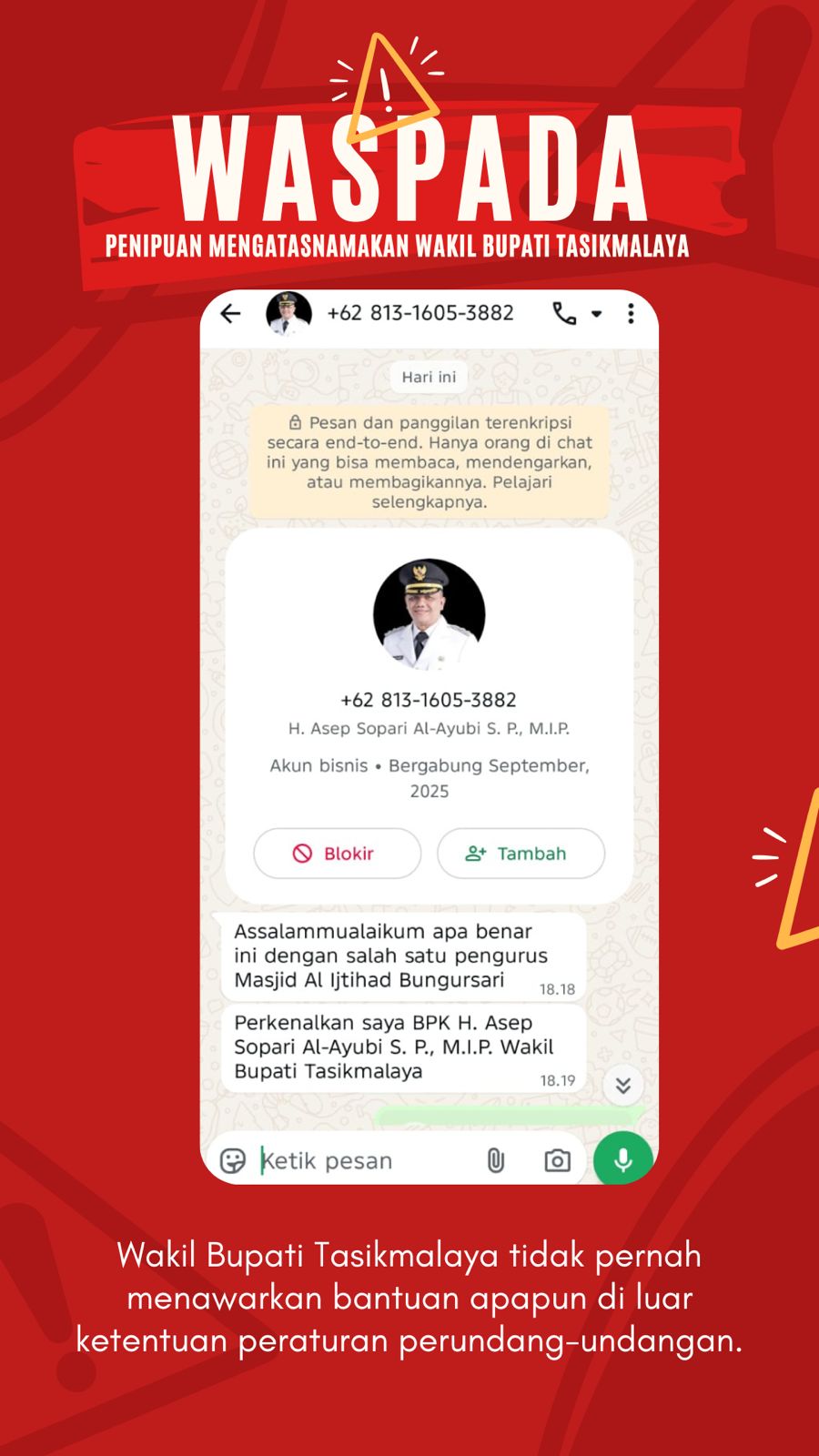 TASIKMALAYA – Masyarakat Kabupaten Tasikmalaya diimbau untuk meningkatkan kewaspadaan menyusul maraknya aksi penipuan yang mencatut nama dan foto Wakil Bupati (wabup) Tasikmalaya, H. Asep Sopari Al-Ayubi, melalui pesan aplikasi WhatsApp.