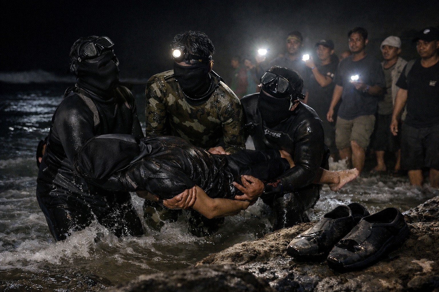Setelah menemukan sepatu tersebut, pencarian dilanjutkan ke arah tengah laut. Surya yang menggunakan sepatu katak memberanikan diri menyelam lebih ke tengah dengan bantuan senter.