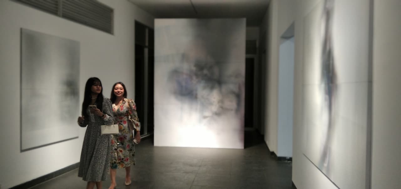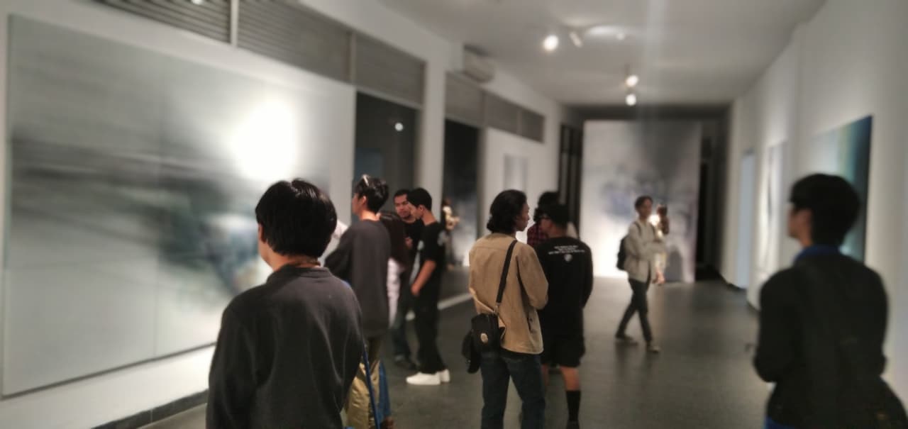 Galih Adika Paripurna melukiskan semua yang menyentuh itu pada puluhan bidang logam datar, kertas konkrit di atas lantai dan lapisan-lapisan akrilik pada dinding galeri.