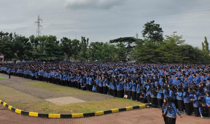 SUKABUMI – Suasana berbeda terlihat di Lapangan Cangehgar, Palabuhanratu, Kabupaten Sukabumi, Kamis (04/12/2025). Ribuan orang berseragam batik Korpri warna biru tampak memadati lapangan.