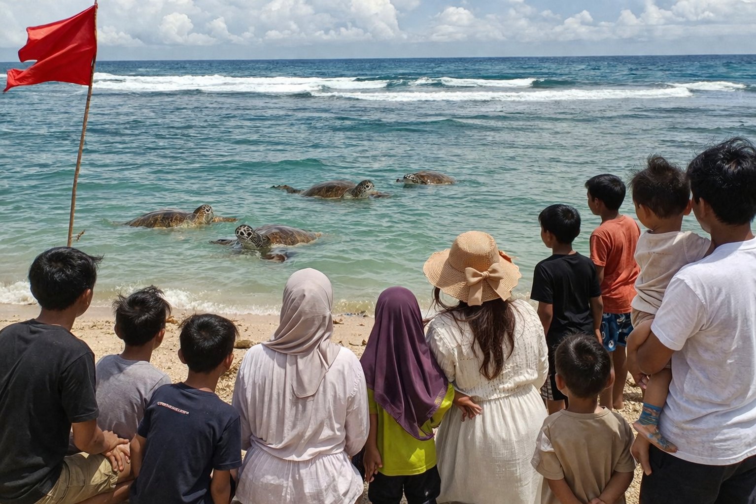 Fenomena langka tersebut terlihat saat air laut relatif tenang, di mana beberapa penyu muncul ke permukaan secara bersamaan di sekitar bibir pantai. Kejadian ini pun sontak menarik perhatian pengunjung yang langsung berkerumun untuk menyaksikan momen tersebut.