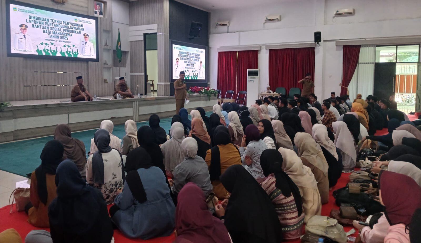 TASIKMALAYA — Sebanyak 351 mahasiswa penerima bantuan pendidikan Kabupaten Tasikmalaya mengikuti kegiatan Bimbingan Teknis (Bimtek) penyusunan laporan pertanggungjawaban di Pendopo Baru Singaparna, Senin (24/11/2025). Bimtek ini digelar Dinas Sosial PPKBP3A Kabupaten Tasikmalaya sebagai bagian dari proses penyaluran bantuan pendidikan tahun 2025.