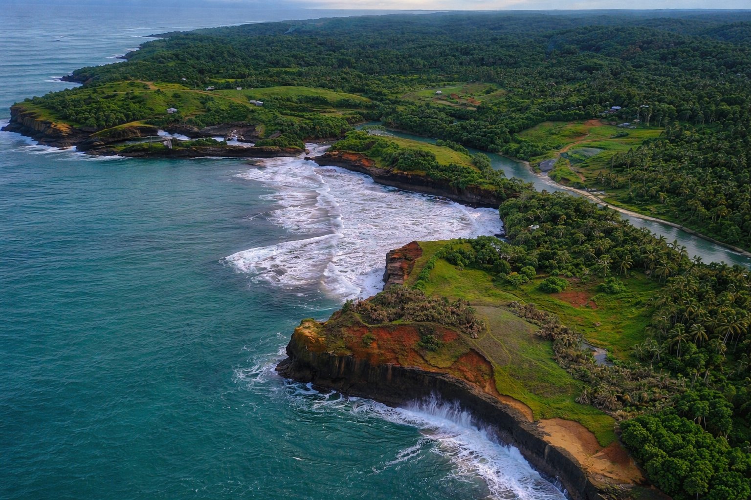 Dari ketinggian, terlihat jelas kontur tebing berlapis dengan warna tanah kemerahan yang kontras dengan hijaunya vegetasi. Ombak besar yang menghantam karang menambah kesan dramatis, sementara hamparan laut biru kehijauan membentang luas hingga ke cakrawala. Keunikan lain dari kawasan ini adalah pertemuan aliran sungai dengan laut yang membentuk lekukan alami nan indah.