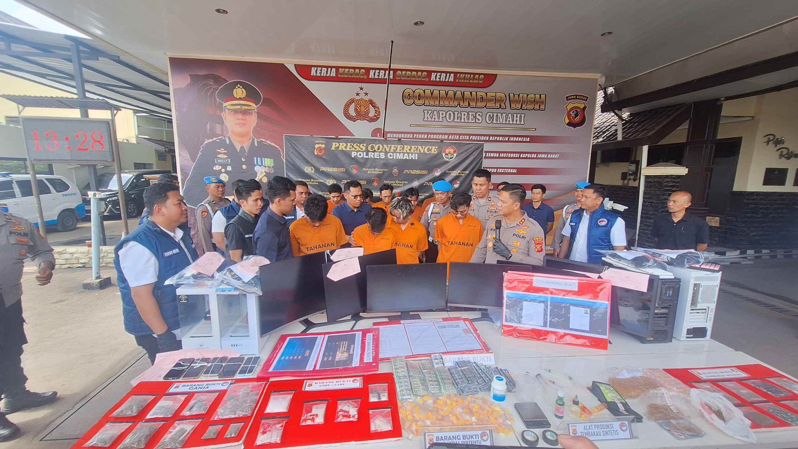 “Kedua fungsi dipimpin langsung oleh Kasat Reskrim dan Kasat Narkoba mendatangi lokasi. Saat penangkapan, kami menemukan empat unit CPU dan enam monitor yang digunakan sebagai alat kerja para tersangka,” ujar Niko dalam konferensi pers di Mapolres Cimahi, Selasa (13/1/2026).