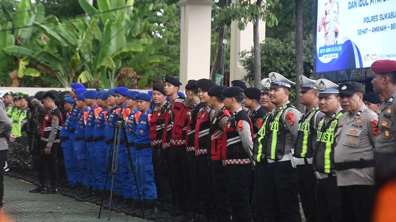 SUKABUMI — Menjelang perayaan Idulfitri 1447 Hijriah, Polres Sukabumi menggelar apel kesiapan pengamanan malam takbir dan Hari Raya Idulfitri di Lapangan Apel Polres Sukabumi, Jumat (20/3/2026).
