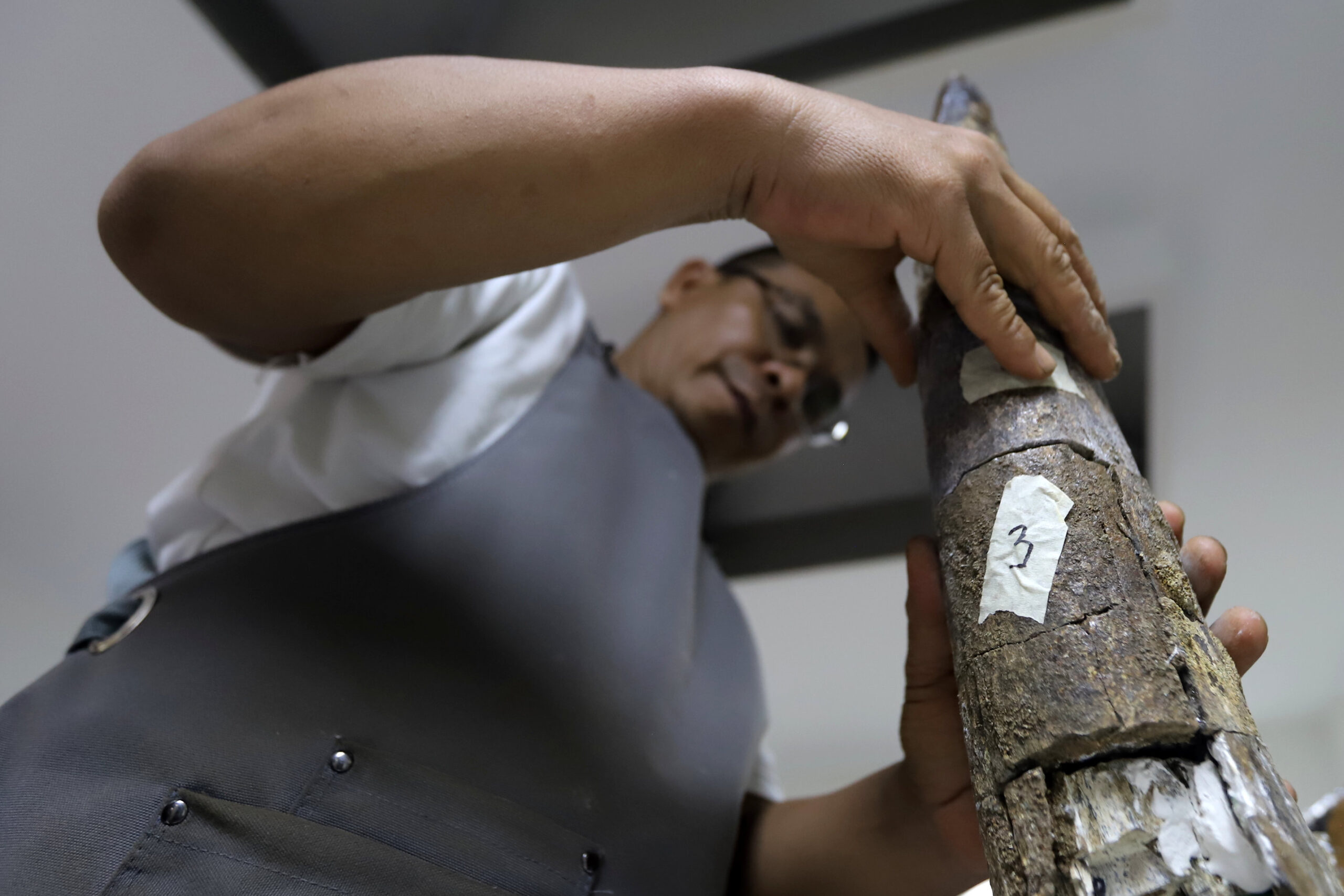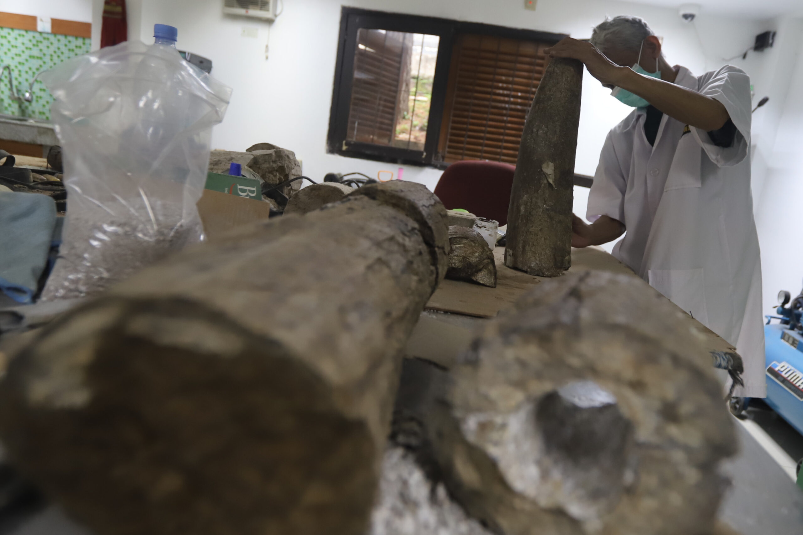 PETUGAS melakukan proses preparasi fosil gajah purba Nganjuk di Museum Geologi Bandung, Jalan Diponegoro, Kota Bandung, Jumat (14/11/2025).