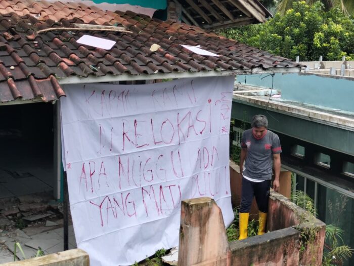 “Kapan Kami Direlokasi? Apa Nunggu yang Mati Dulu?” dikutip dari tulisan yang tertera di spanduk yang dipasang warga Kampung Gempol.
