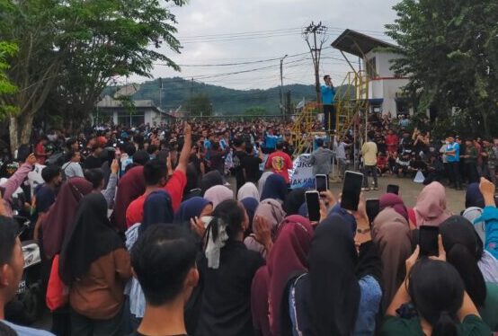 SUKABUMI – Aksi unjuk rasa dilakukan ribuan pekerja PT Muara Tunggal di Kecamatan Cibadak, Kabupaten Sukabumi, Rabu (18/2/2026). Sedikitnya 2.800 buruh yang tergabung dalam Serikat Pekerja Nasional Kabupaten Sukabumi turun ke area perusahaan untuk menuntut pembayaran Tunjangan Hari Raya satu bulan upah bagi karyawan dengan masa kerja di atas satu tahun.