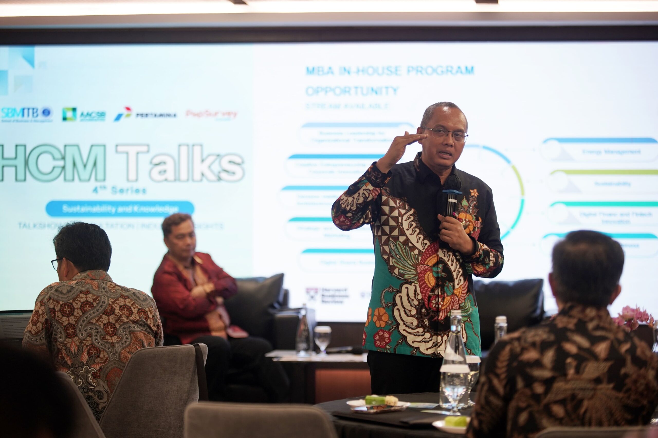 JAKARTA – Sekolah Bisnis Manajemen Institut Teknologi Bandung (SBM ITB) menggelar HCM Talks keempat bertema “Sustainability and Knowledge” bekerja sama dengan Pertamina. Acara ini membahas isu strategis mulai dari keberlanjutan, manajemen pengetahuan, pengembangan talenta, budaya inklusif, hingga pemanfaatan data dan HR analytics.