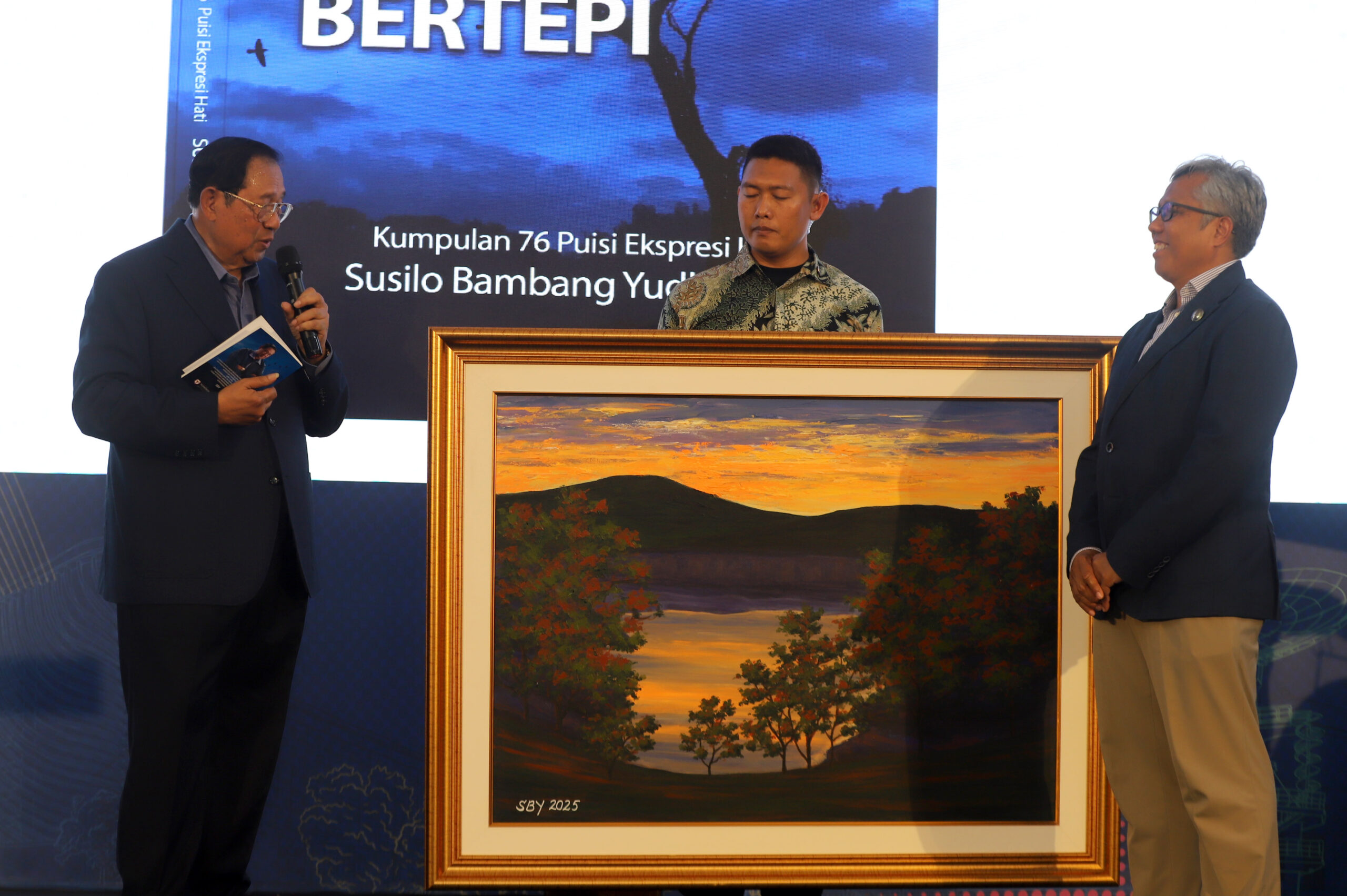 JABARKU.ID – Mantan Presiden ke-6 Republik Indonesia, Susilo Bambang Yudhoyono (SBY), menyerahkan sebuah lukisan karyanya kepada Institut Teknologi Bandung (ITB) yang diterima oleh Rektor ITB Prof. Dr. Ir. Tatacipta Dirgantara, M.T. seusai orasi kebudayaan pada acara Adicitra Ganesha 2025, di Aula Barat kampus ITB, Jalan Ganesha, Kota Bandung, Rabu (8/10/2025).
