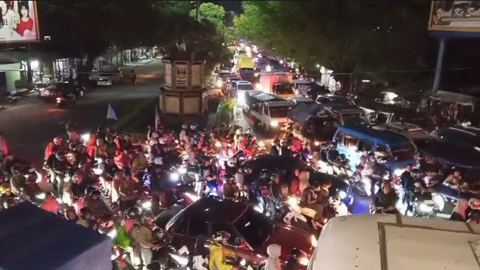 Pantauan dari udara menggunakan drone memperlihatkan antrean panjang kendaraan roda dua dan roda empat yang saling berhimpitan di persimpangan. Bahkan, di sejumlah titik, kendaraan terlihat tidak bergerak sama sekali.
