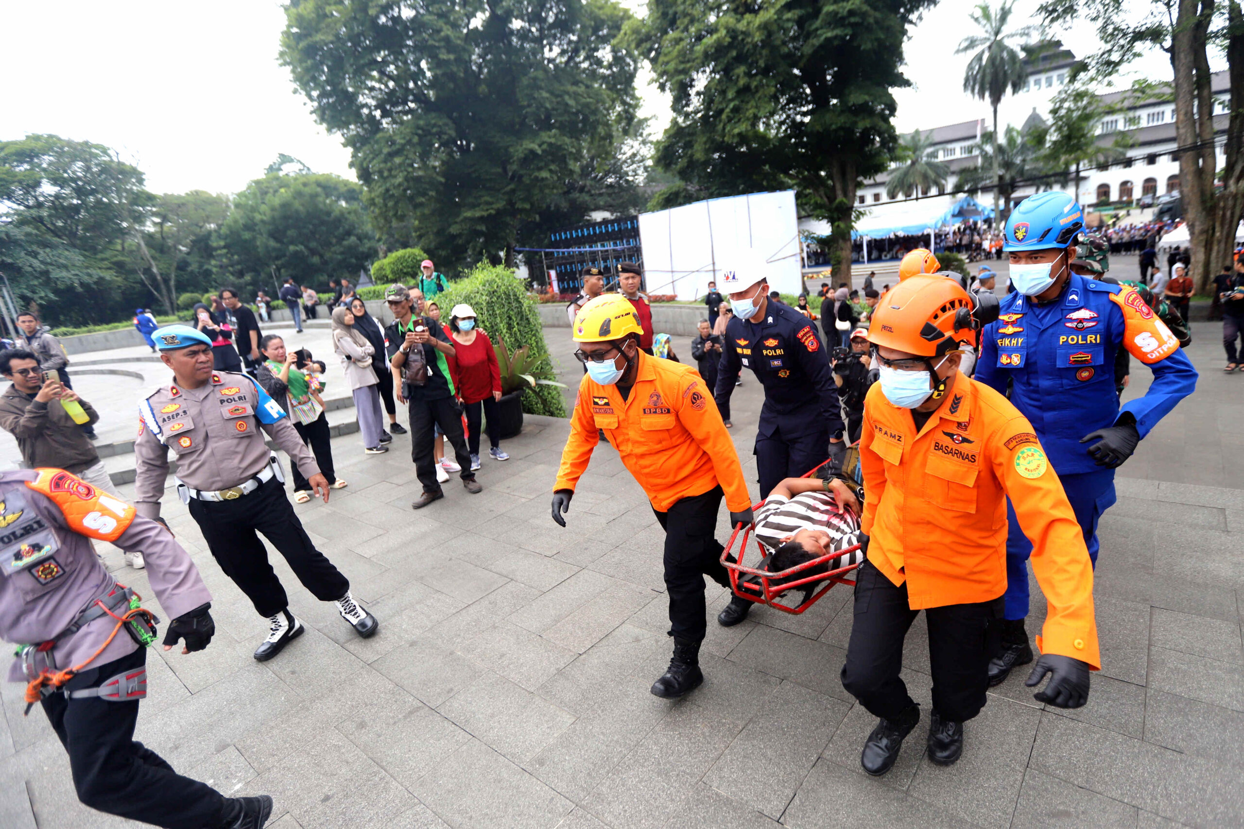 PETUGAS gabungan dari Polri, TNI, BPBD dan relawan mengevakuasi korban bencana alam saat simulasi Siaga Tanggap Bencana Polda Jawa Barat 2025, di depan Gedung Sate, Jalan Diponegoro, Kota Bandung, Rabu (5/11/2025).