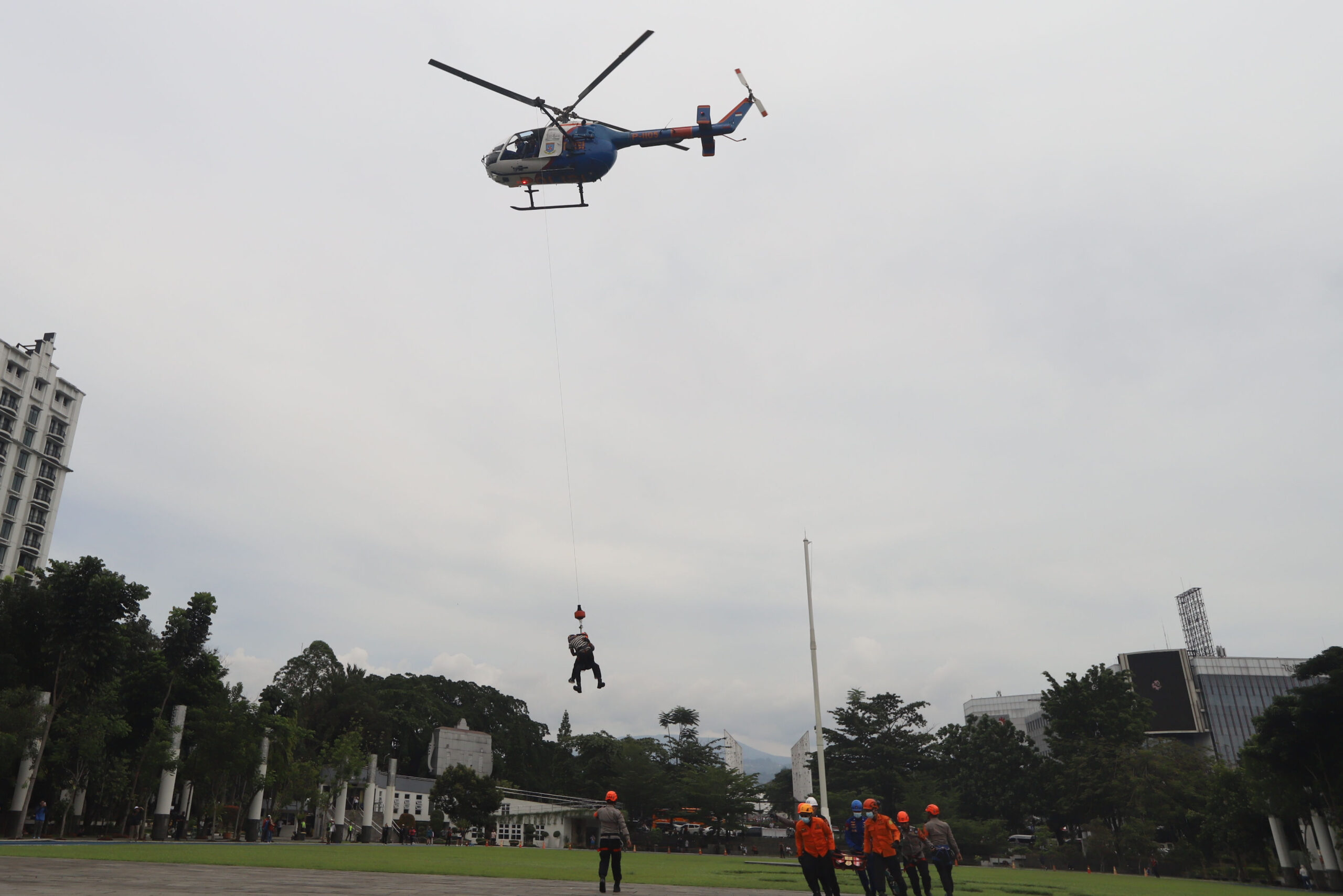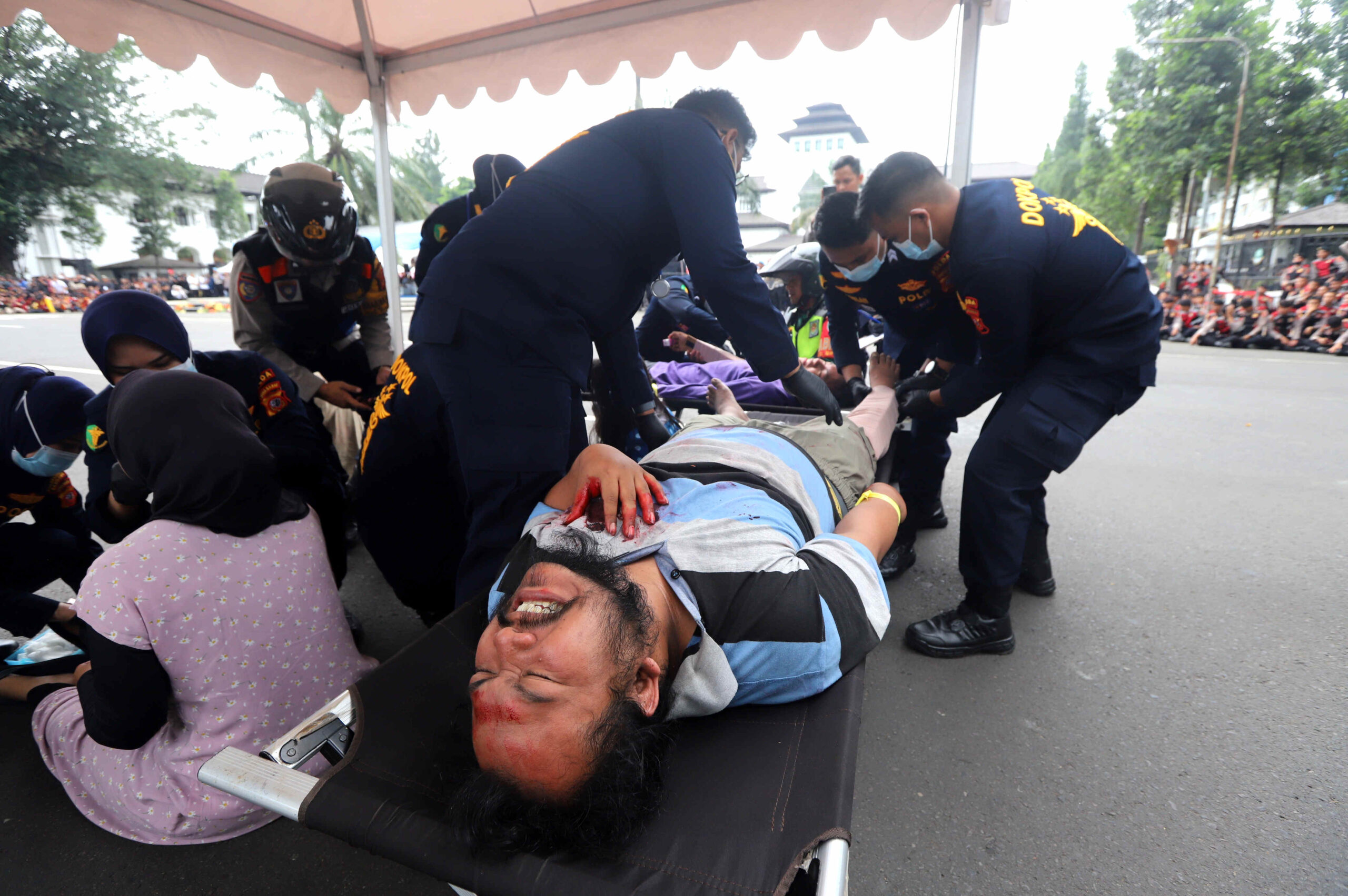 PETUGAS gabungan dari Polri, TNI, BPBD dan relawan mengevakuasi korban bencana alam saat simulasi Siaga Tanggap Bencana Polda Jawa Barat 2025, di depan Gedung Sate, Jalan Diponegoro, Kota Bandung, Rabu (5/11/2025).