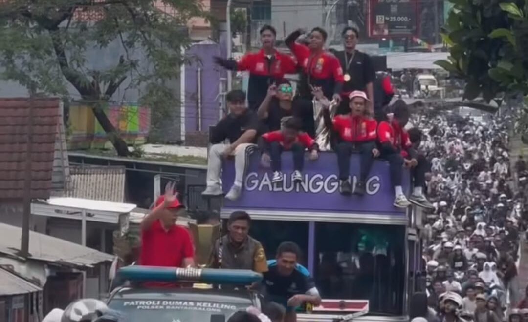 Iring-iringan kendaraan yang membawa para pemain berjalan perlahan menembus kerumunan. Sorak-sorai, tepuk tangan, dan peluit tak berhenti sejak rombongan melintas di Simpang menuju GDI Bantarkalong. Setiap orang ingin menyentuh atau sekadar melihat para juara yang kini menjadi kebanggaan Tasikmalaya Selatan (Tasela).