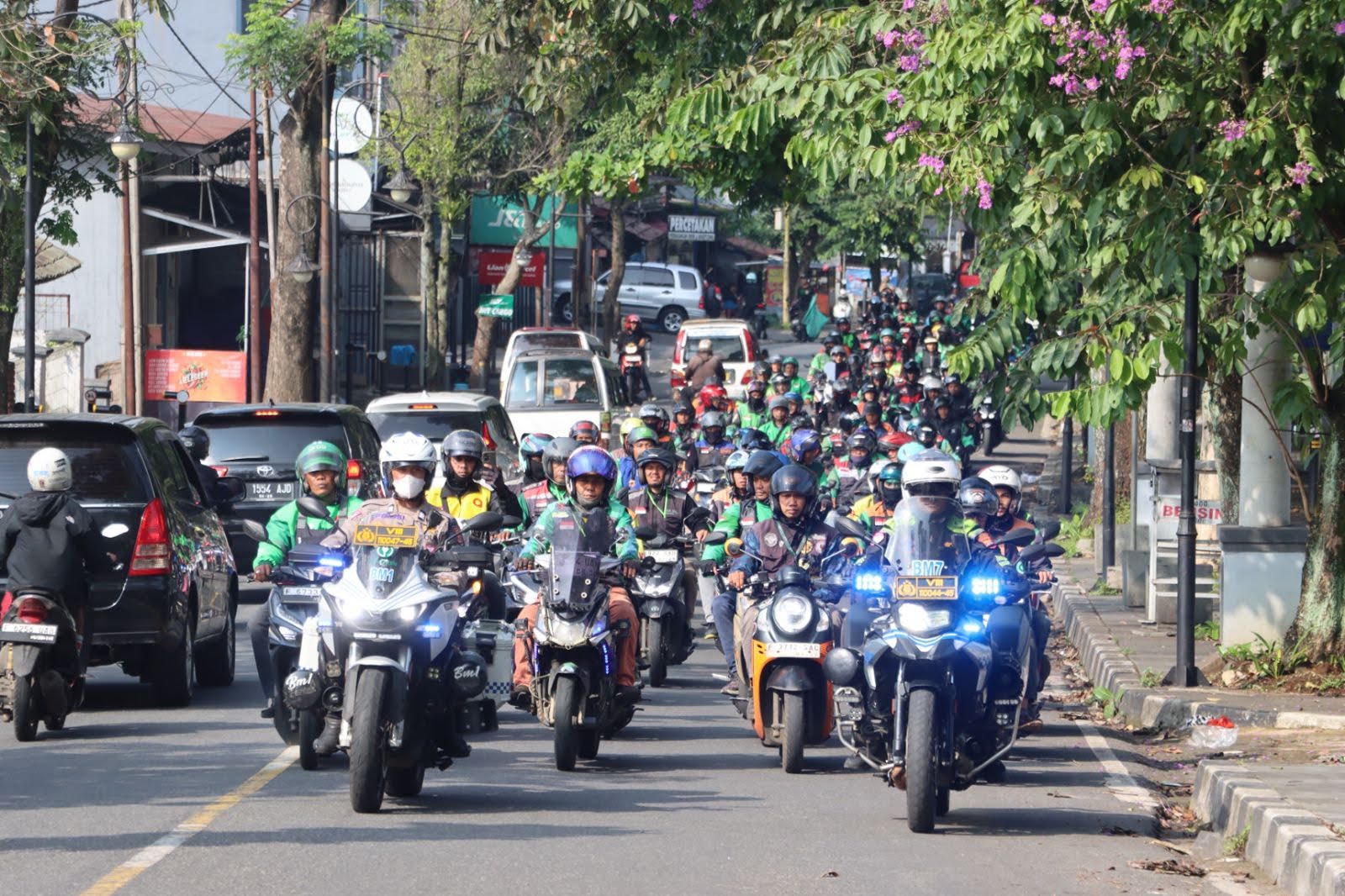 Sejak pagi, para driver ojol sudah memadati jalanan dalam iring-iringan konvoi menuju lokasi acara. Perjalanan mereka mendapat pengawalan dari jajaran Sat Lantas Polres Sukabumi Kota guna memastikan keamanan dan ketertiban selama di perjalanan.