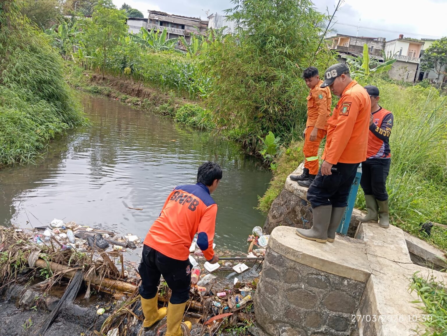 Sebagai langkah cepat, enam personel BPBD diterjunkan untuk membersihkan sampah yang menyumbat agar aliran air kembali lancar.